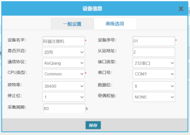 輸入設(shè)備名稱(任意),設(shè)備序號(任意,注意同一網(wǎng)關(guān)下的設(shè)備序號不能重復(fù)),從站地址(設(shè)備站號),通信協(xié)議(KeQiang,根據(jù)注塑機型號選擇),接口類型(232串口),串口號(連接網(wǎng)關(guān)端串口號),以及串口參數(shù)(一般注塑機默認(rèn)波特率是38400,數(shù)據(jù)位8,無校驗,停止位1),采集周期根據(jù)自身需求設(shè)置,然后點擊保存。