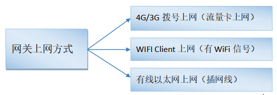 進(jìn)入網(wǎng)關(guān)WEB管理界面(http://192.168.2.1/)設(shè)置聯(lián)網(wǎng)方式,可選WIFI網(wǎng)絡(luò)、3/4G網(wǎng)絡(luò)(需要在網(wǎng)關(guān)通電前插入手機(jī)SIM卡,默認(rèn)已開啟3/4G網(wǎng)絡(luò))、WAN外網(wǎng),三者只能選一個(gè)。