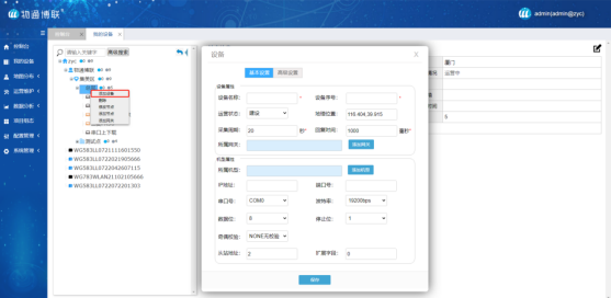 登錄物通博聯(lián)·設(shè)備云平臺(tái)(https://iot.wtblnet.com/),進(jìn)入“我的設(shè)備”編輯模式,添加節(jié)點(diǎn)、設(shè)備與機(jī)型信息。