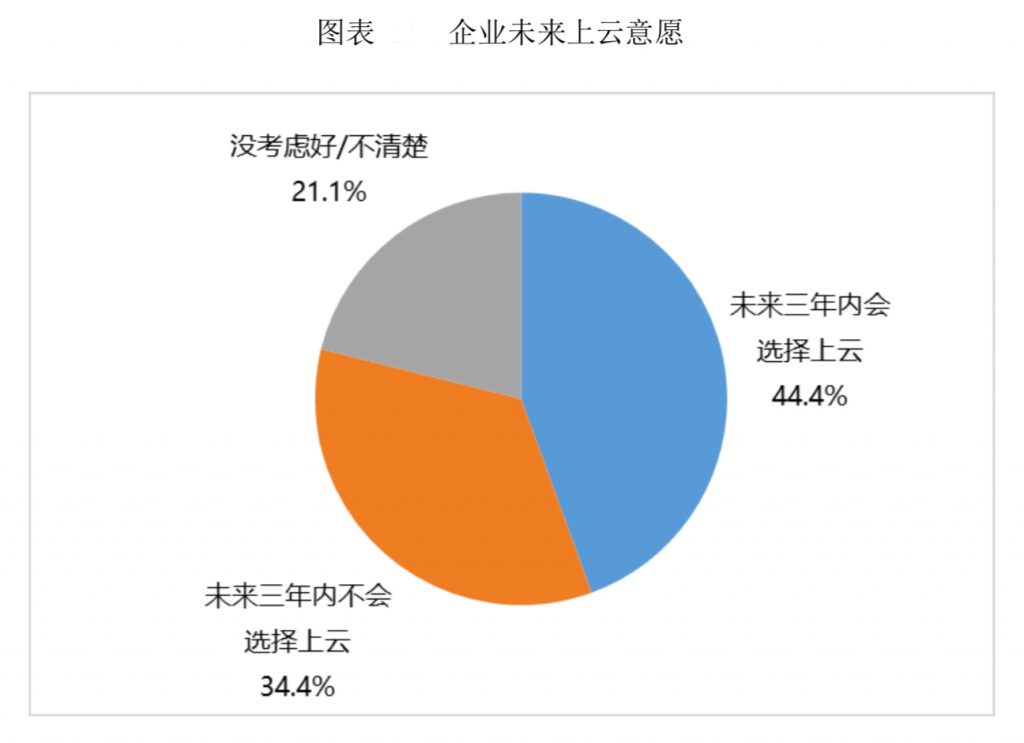 在沒有選用云服務(wù)的企業(yè)用戶中,超越40%的企業(yè)計(jì)劃在未來三年內(nèi)開端選用云服務(wù)模式,未上云企業(yè)依然存在比較強(qiáng) 的上云志愿,全體來看,我國企業(yè)事務(wù)上云還處于起步階段,未來的商場(chǎng)潛力巨大。