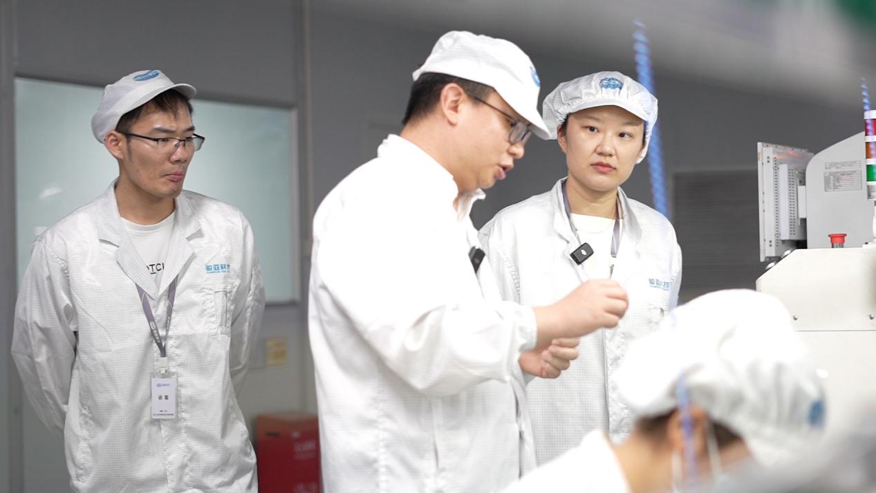 肖婷婷(右1)和同事在調(diào)研智能設(shè)備生產(chǎn)情況。 海外網(wǎng) 康杰/攝