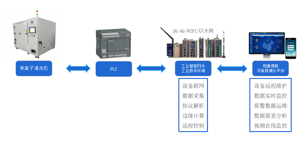 對此,物通博聯(lián)提供以工業(yè)智能網(wǎng)關(guān)為核心的等離子清洗機(jī)PLC數(shù)據(jù)采集遠(yuǎn)程監(jiān)控系統(tǒng)方案。通過將網(wǎng)關(guān)連接PLC,能夠?qū)崟r采集PLC內(nèi)部的各種數(shù)據(jù),包括模擬量、數(shù)字量、開關(guān)量等,如等離子功率、氣體流量、真空度等參數(shù)。隨后以5G/4G/WIFI/以太網(wǎng)等方式對接到云平臺或上位機(jī)中,從而工廠、設(shè)備制造商制定決策提供全面可靠的數(shù)據(jù)支持。