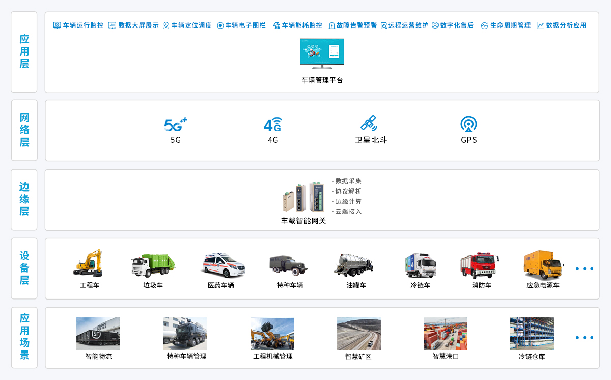 物通博聯(lián)針對特種車輛數(shù)字化需求,以車載智能網(wǎng)關為核心,實時采集車輛行駛參數(shù)、動力系統(tǒng)狀態(tài)、作業(yè)設備工況等關鍵數(shù)據(jù),通過邊緣側(cè)本地化計算完成數(shù)據(jù)清洗、格式標準化處理。再依托 5G/4G 無線通信或北斗網(wǎng)絡,將標準化數(shù)據(jù)上傳至特種車輛管理平臺。平臺實現(xiàn)車輛位置實時追蹤、運行狀態(tài)遠程監(jiān)控、異常情況及時預警,為特種車輛高效調(diào)度與安全管理提供技術支撐。