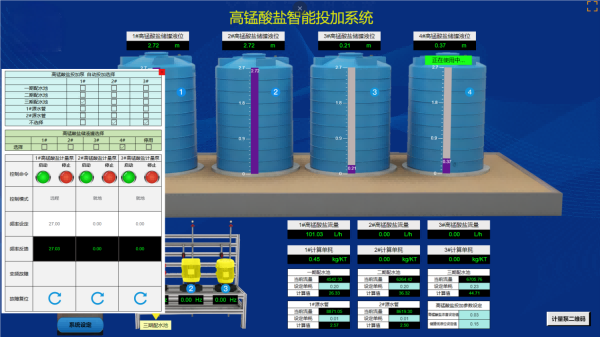 基于云組態(tài)功能還原加藥工藝流程,快速查詢高錳酸鉀儲液罐、計量泵、配水池等設備狀態(tài)與工藝參數(shù),一目了然。